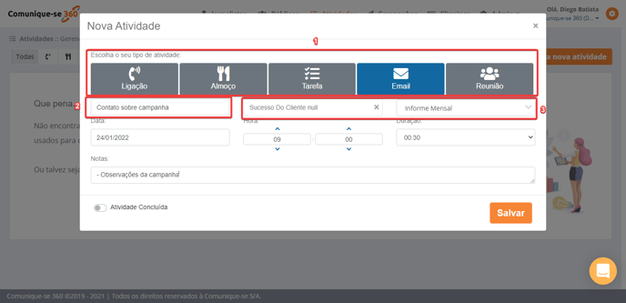 Contato / Campanha - Permite associar a atividade a um contato e/ou campanha existente.