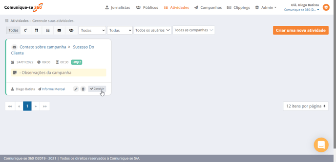 A área de atividades serve como uma agenda de eventos, nela você poderá deixar marcado quais jornalistas precisa entrar em contato e/ou quais clientes precisa gerar um relatório. Sua usabilidade é bem simples.