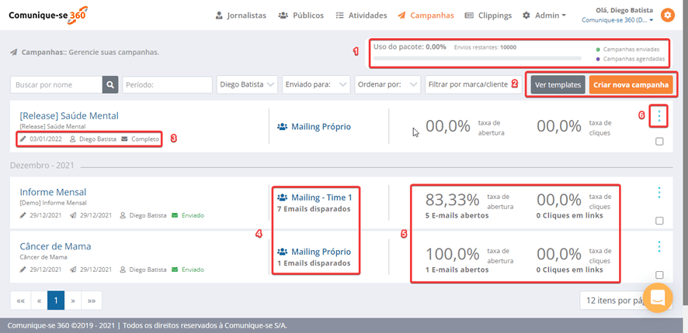 Em campanhas você pode criar e acompanhas os releases que envia pelo sistema. A página principal de campanhas apresenta a listagem de campanhas sendo trabalhadas e já enviadas.