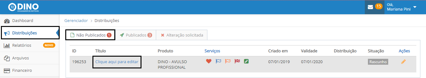 1 - Entre no seu Gerenciador, clique em Distribuições > Não publicados > Clique aqui para editar (lembrando que você vai precisar de um novo disparo para essa publicação).