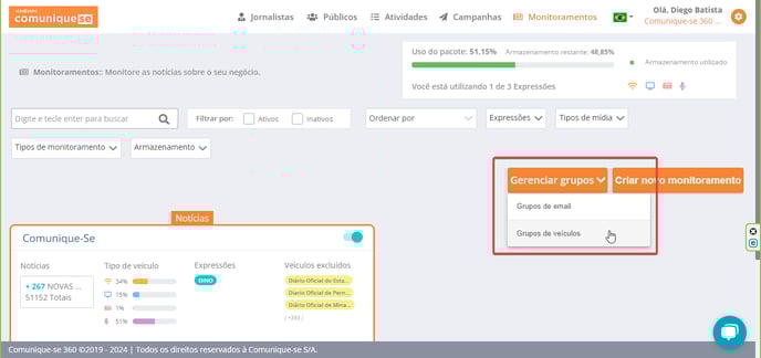 Em grupos de veículos você pode salvar listas de veículos e poderá selecionar elas em vários monitoramentos, seja para excluir os veículos da lista no monitoramento ou restringir a busca do monitoramento a apenas aqueles veículos.