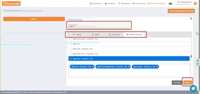 A tela de configuração se abrirá, aqui você pode selecionar o título do seu grupo e iniciar a seleção dos veículos, que estão separados por tipo de mídia. Para finalizar clique em Salvar: