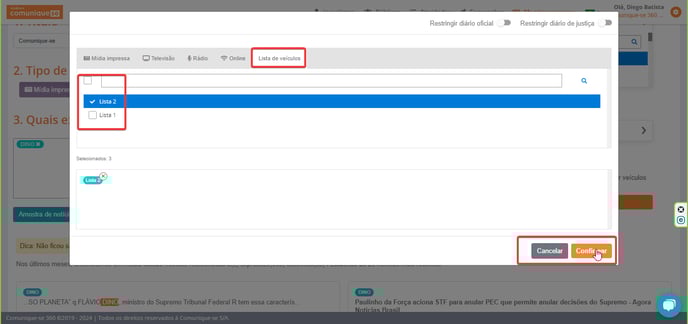 A lista será salva e você poderá selecionar ela em Excluir ou Restringir quando estiver montando ou editando um monitoramento, basta ir na aba Lista de veículos, selecionar a lista e clicar em confirmar. Pronto, agora sua lista está selecionada, é só finalizar a configuração do monitoramento e salvá-lo.