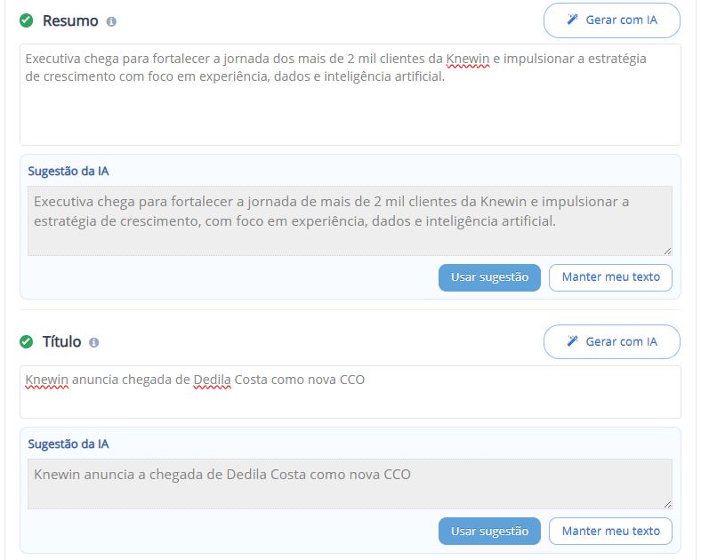 Ao solicitar o apoio da IA, abaixo do campo correspondente, você receberá a sugestão que pode ser aceita ou se preferir, pode ignora-la e manter o seu conteúdo original.