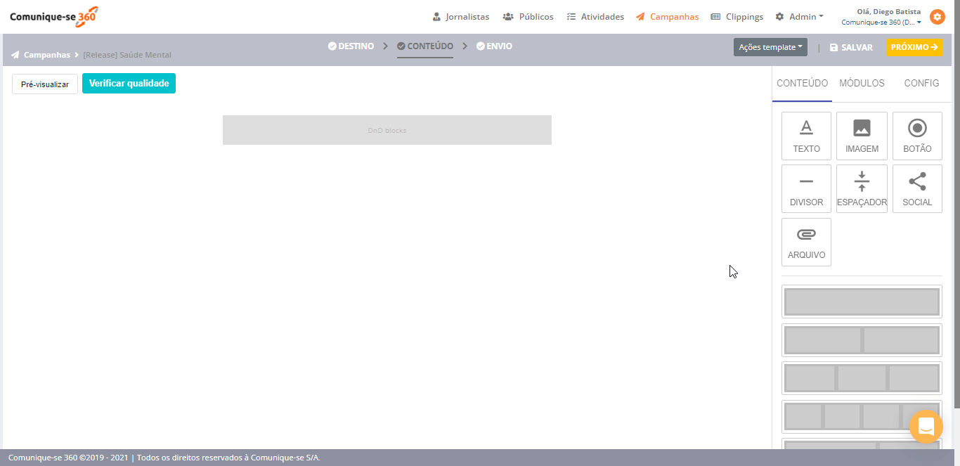 No menu lateral direito de conteúdos, arraste o bloco IMAGEM para o e-mail. Então clique nele, o menu lateral mudará e permitirá você realizar o upload da imagem ao clicar em Procurar ou inserir o link dela no campo abaixo.