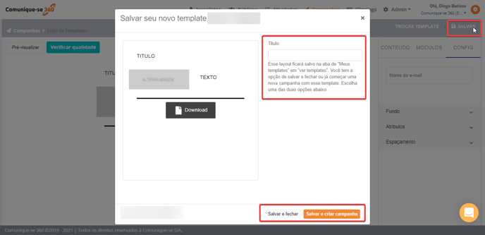 Para Salvar, dê um titulo ao seu template e selecione uma das opções abaixo (Salvar e fechar ou Salvar e criar campanha).