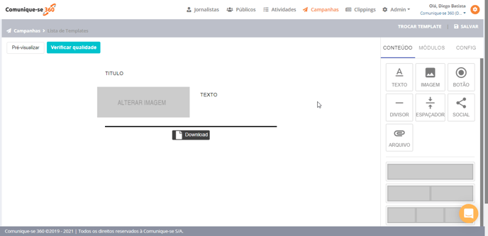Para alterar um template, basta clicar nele e a tela de edição se abrirá e permitirá que você realize as mudanças que precisa. O editor que será mostrado é o mesmo utilizado na criação de campanhas, na etapa Conteúdo, basta seguir o mesmo processo e ao final, clicar em Salvar: