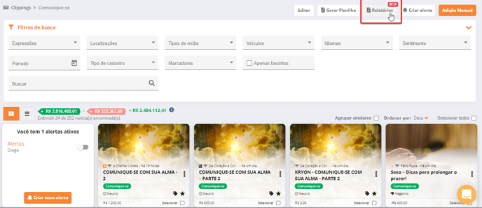 Para iniciar a criação de seu relatório, clique em Relatórios dentro do monitoramento.