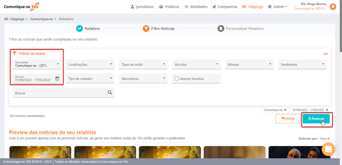 No próximo passo os filtros de busca serão apresentados, os dados gerados no relatório serão sempre baseados na filtragem selecionada, portanto, se eu desejar um relatório apenas do mês de Maio, no filtro Período eu selecionaria os dias de Maio e clicaria em Avançar. A mesma ideia serve para os demais filtros, caso eu precise de um relatório de apenas algumas Expressões específicas, basta selecioná-las no filtro Expressões.
