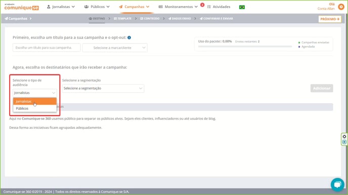 Selecione o tipo de destinatário - Aqui você irá selecionar se a lista que você adicionar é de Jornalistas ou de Públicos.- Jornalistas - São as listas criadas a partir de nosso mailing, no menu Jornalistas.