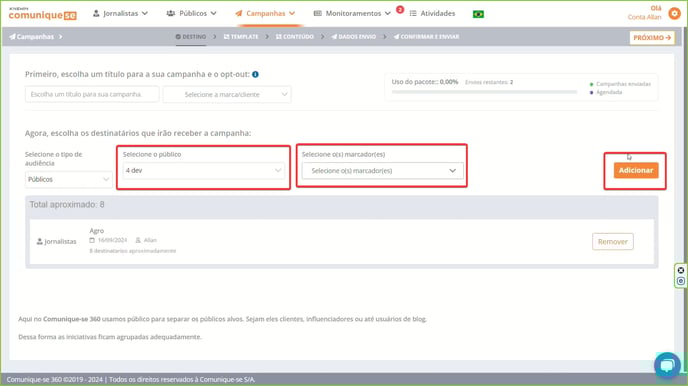 Selecione o público - Aqui você selecionará a lista de público que deseja adicionar ao envio.