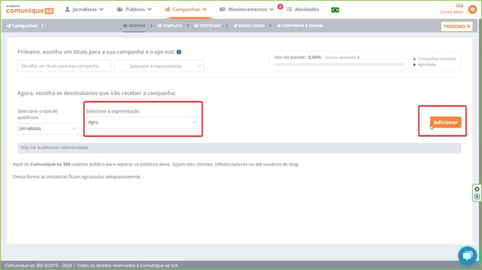 Selecione a segmentação - Aqui você selecionará a sua segmentação que deseja adicionar ao envio.