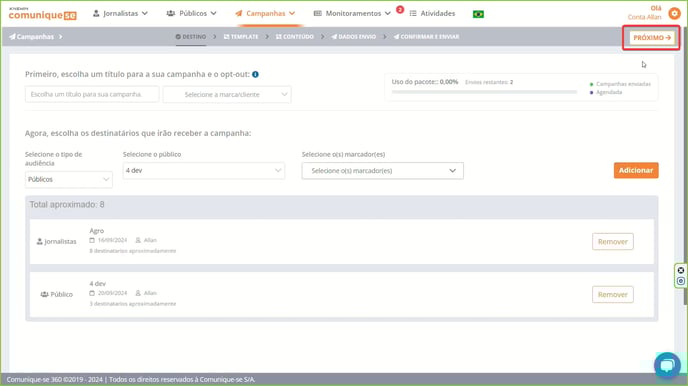 Na primeira etapa (Destino) da criação de sua Campanha, você irá selecionar um título, definir marcas/clientes e escolher para quais listas quer enviar, vamos começar?