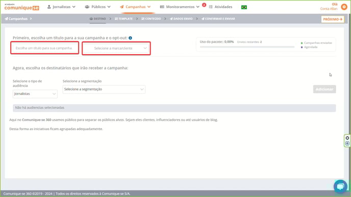 Título - Insira o título interno de sua campanha, ele é usado para identificá-la dentro do sistema, não é o assunto que chegará ao jornalista.Marca/Cliente (Opcional) - É utilizado para opt-out. Para utilizá-lo é necessário que você cadastre a Marca/Cliente previamente. Se eu tiver 02 marcas, A e B, e a campanha foi enviada para a marca A, caso um jornalista se desinscreva, ele ainda receberá campanhas da marca B, mas nada da marca A. Se o campo não for utilizado e um jornalista se desinscrever, ele é desinscrito da conta inteira.