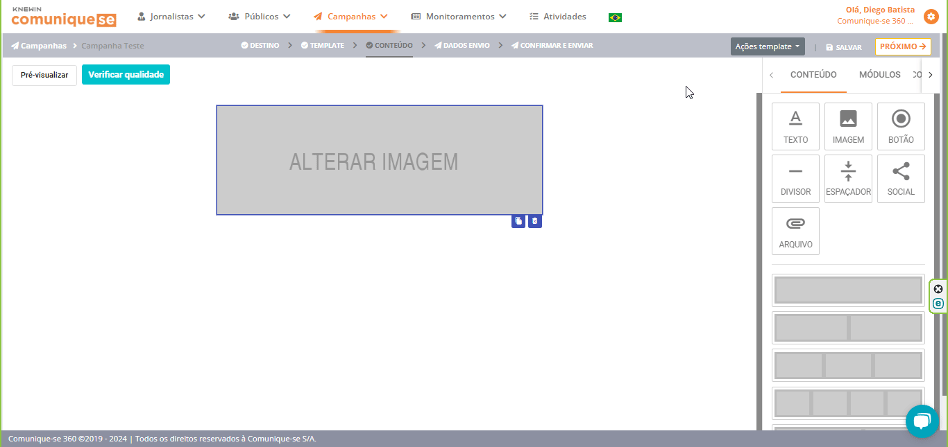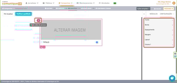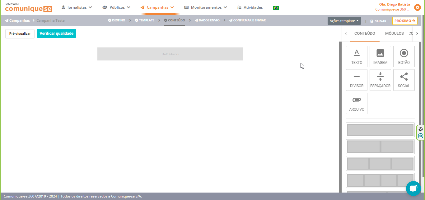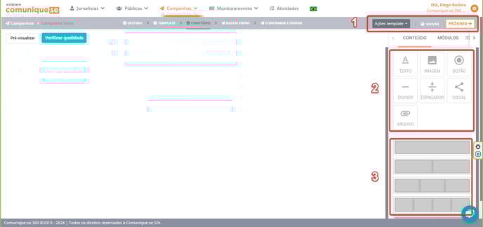 Nessa etapa iremos configurar o e-mail que será enviado pela campanha. A lógica de nosso editor segue 2 ideias: