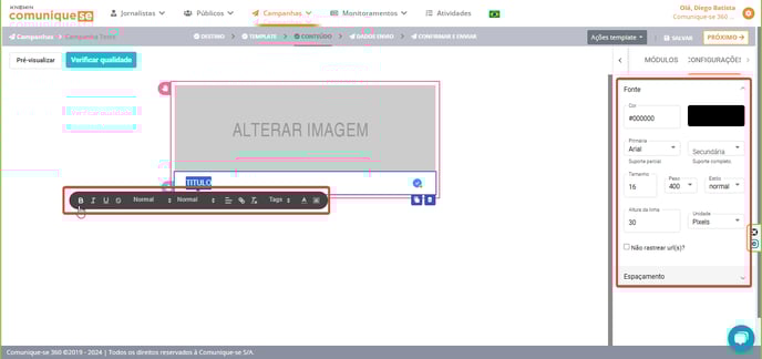- ATENÇÃO: Ao colar o texto na área de conteúdo, utilize sempre a opção “Colar sem formatação”. Isso é fundamental para evitar que estilos ou formatações externas prejudiquem a exibição correta da campanha.