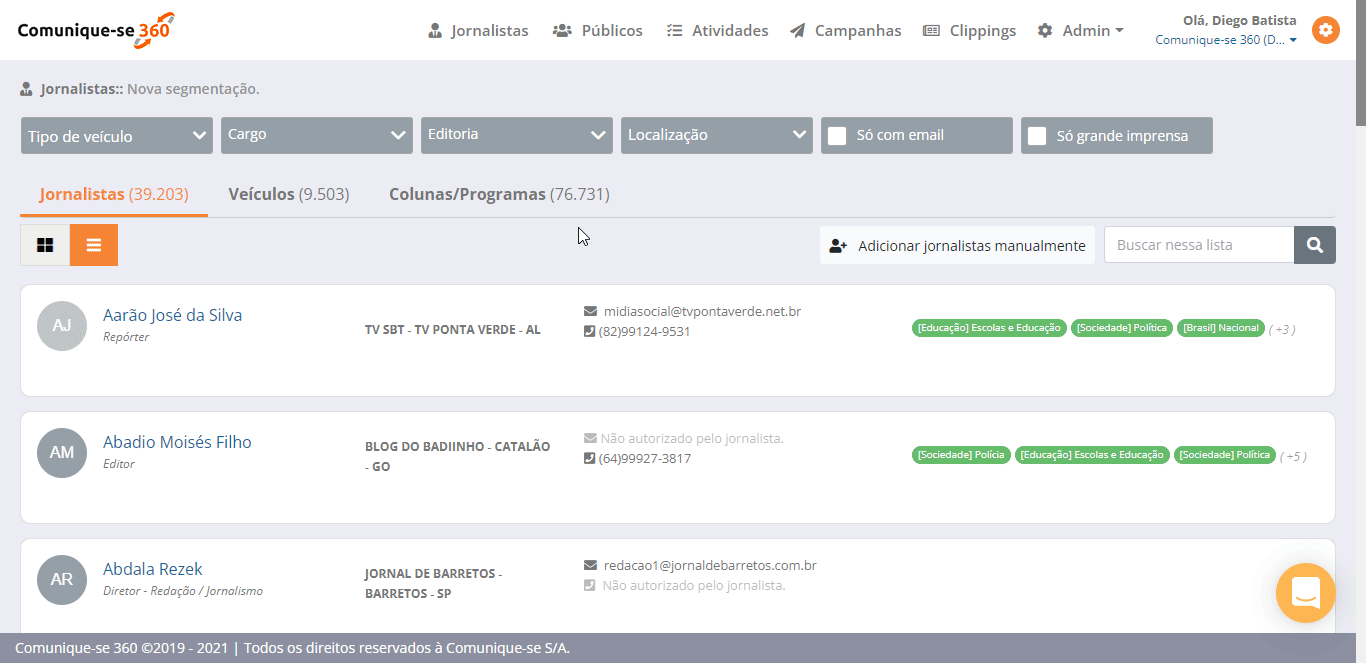 Veja que assim que eu seleciono os filtros, a tela é atualizada para me trazer apenas Jornalistas e Veículos que estejam conforme as informações que selecionei nos filtros.