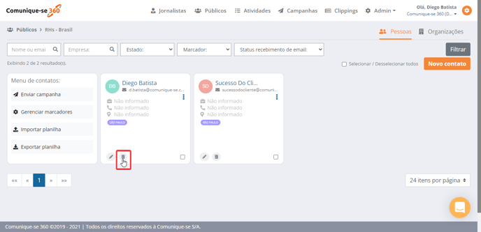 O sistema permite que você exclua contatos de duas formas, individualmente ou em massa.