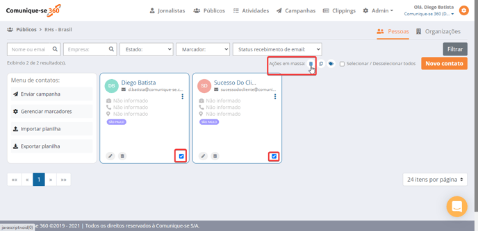 Para excluir vários contatos, selecione o checkbox abaixo dos contatos que quer excluir e utilize a opção de Excluir no menu Ações em massa que se abrirá: