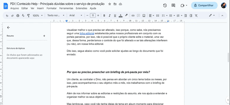 Hoje, nós pedimos que toda solicitação de alteração em texto de Produção seja feita por meio de comentários no arquivo de Docs que enviamos. Dessa forma conseguimos visualizar melhor o que precisa ser alterado.