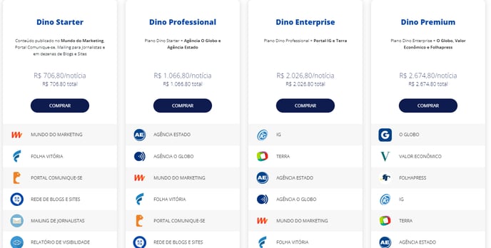 Em nossa página de planos, é possível visualizar os principais parceiros que englobam o plano escolhido para publicação e simular uma compra:
