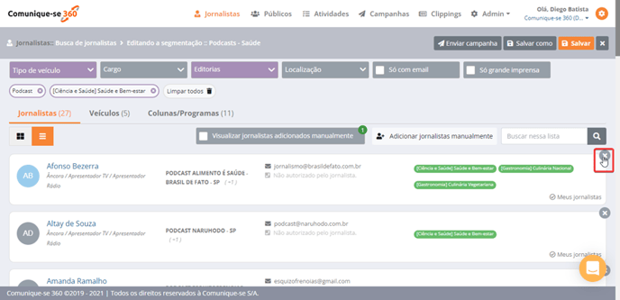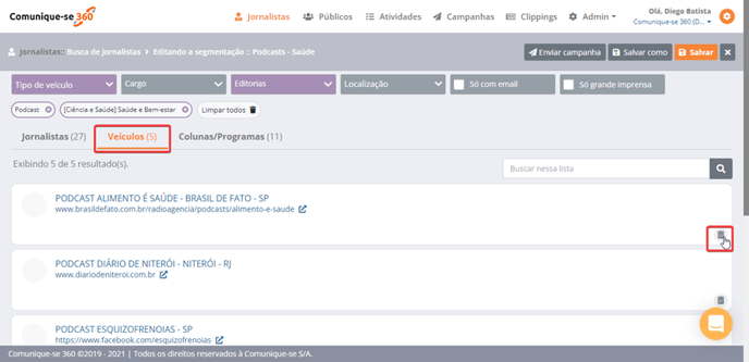 Selecionando a aba Veículos, o sistema te permite excluir um veículo inteiro da segmentação. Dessa forma, todos os jornalistas daquele veículo serão removidos da segmentação: