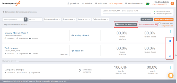 Do lado direito, ao fim de cada campanha, marque nas caixas quais campanhas deseja que constem no relatório;
